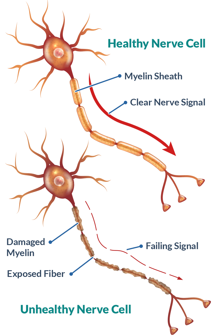 But when the myelin sheath is weakened and ripping apart, electrical signals get jumbled up along the way. It’s like hitting roadblocks on the freeway.